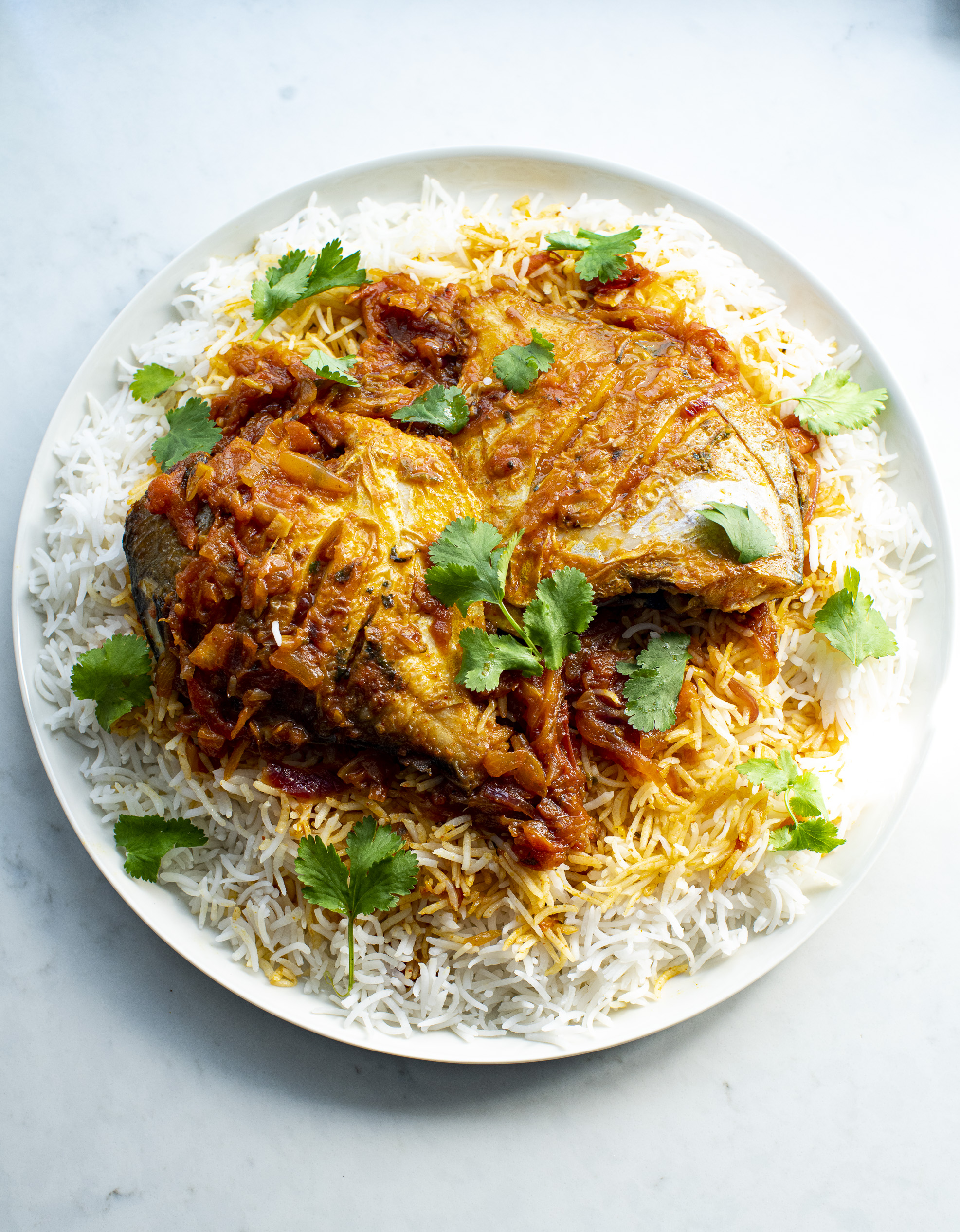 Fish and Basmati rice dish cooked with North Indian spices, tomatoes, ginger, mint and fresh herbs
