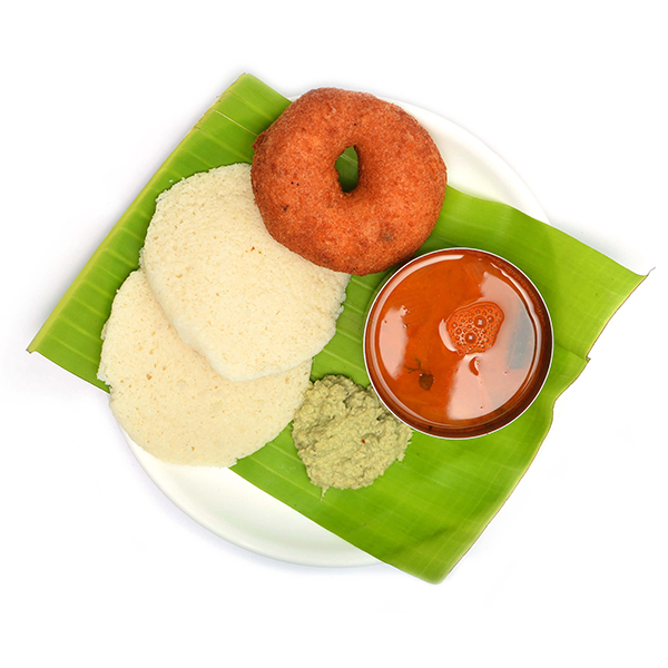 Steam rice cakes and deep fried savory lentil donuts served with sambar, coconut chutney and tomato-ginger chutney.